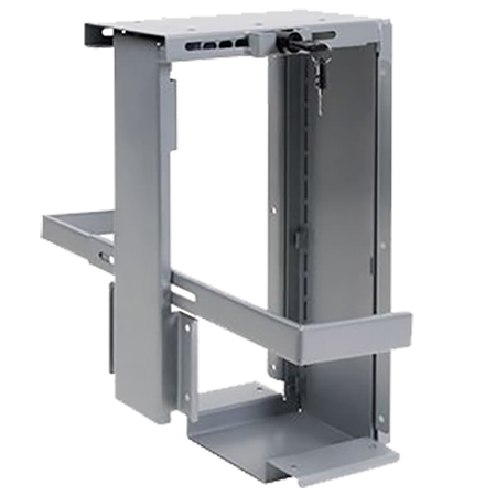 Een afsluitbare, diefstalwerende CPU houder. In zwart en zilver. Breedte instelbaar 9 tot 21 cm. Hoogte 37 tot 57 cm.