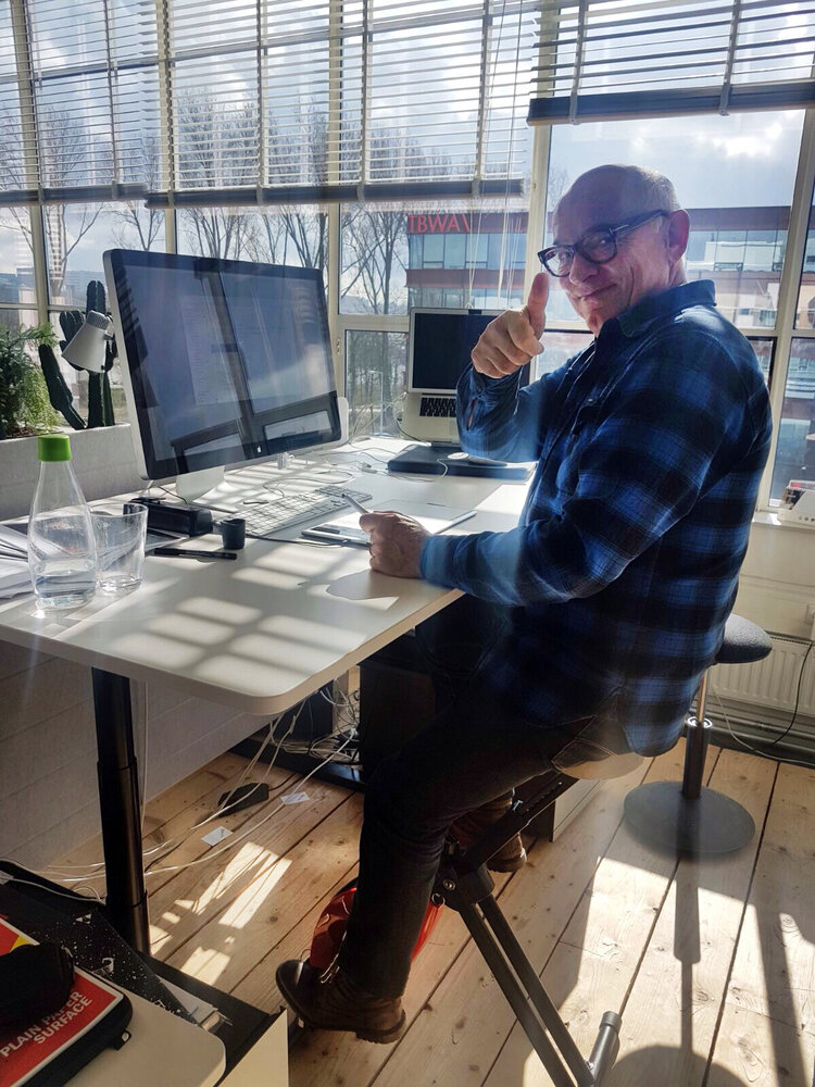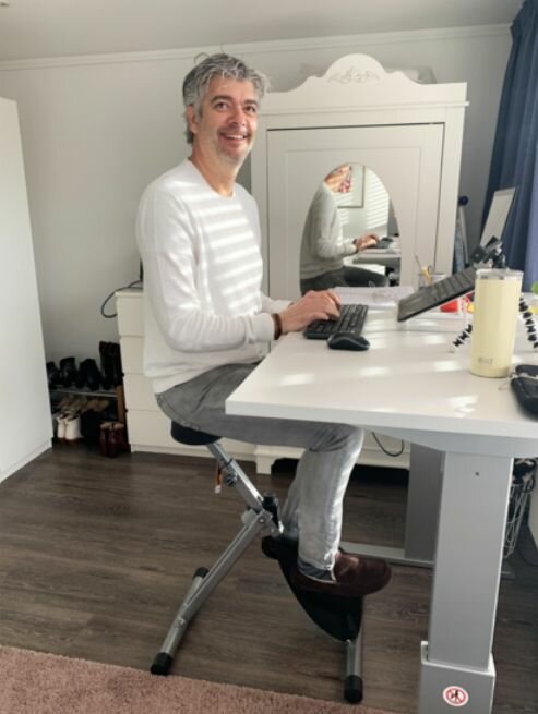 Hoewel ik in mijn vrije tijd veel beweeg bleek ik nog fout bezig. Ik heb mijn manier van werken (achter de pc) in twee stappen geoptimaliseerd. Eerst een werkblad op stahoogte. Bleek nog te statisch en is maar een paar uur per dag vol te houden. De deskbike was de volgende stap. Heel rustig trappend, heb ik hem nu vier weken met veel plezier uitgeprobeerd. In het begin veel lacherige reacties van mijn collega’s. Het zet ze wel aan het denken.