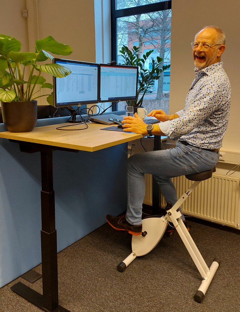 Wat een aanwinst. Zat ik voorheen uitsluitend statisch achter mijn bureau, nu doe ik mijn werk vooral fietsend en staand en met meer plezier. Dit is mogelijk dankzij de aanschaf van een deskbike en een sta/zittafel. Zo'n tafel is overigens wel noodzakelijk als je een deskbike wilt gebruiken. De `fiets' vergt namelijk wel een bladhoogte van ruim 1 meter. De deskbike werkt al snel verslavend, wat in het begin nogal wat zadelpijn opleverde. Door gedoseerd te fietsen en de nodige gewenning, is dat probleem vrijwel opgelost. Aardig is ook het bijgeleverde display, zodat je aan het einde van de dag kunt zien hoeveel kilometer je hebt getrapt en calorieën hebt verbruikt. Het gaat inmiddels om aardige afstanden en stapels boterhammen. Zo werk je dagelijks letterlijk aan je gezondheid.