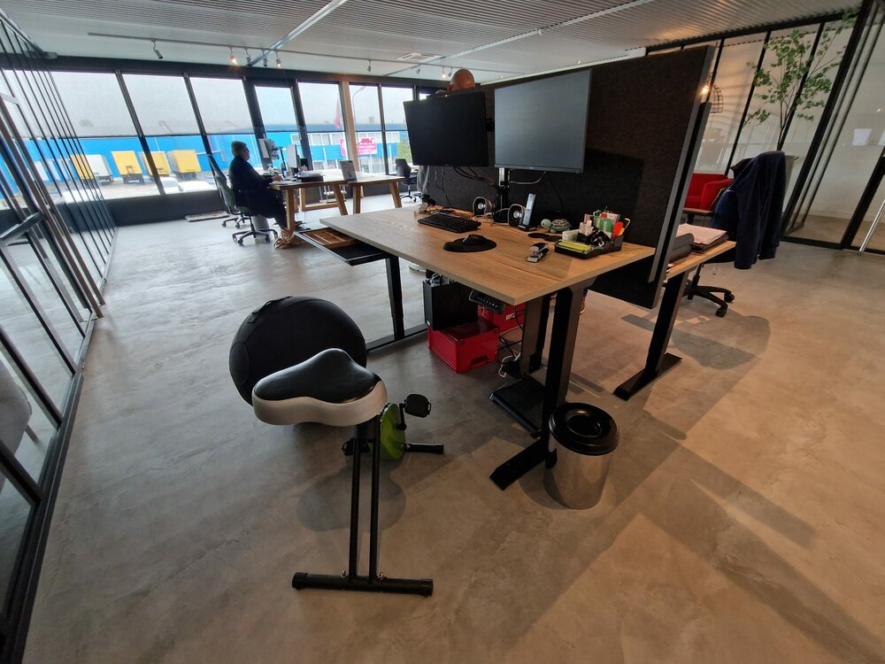 Sinds we de bikes hebben is staat mijn bureau altijd op de hoogste stand, klaar voor een desk bikes van zodra er eentje vrij is. Mijn hele werkplek is er door veranderd.