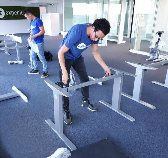 Worktrainer werkt voor de montage van zit-sta bureaus en het verzenden van pakketten samen met Ferm Werk, een sociale werkmaatschappij die mensen met een afstand tot de arbeidsmarkt ondersteunt.