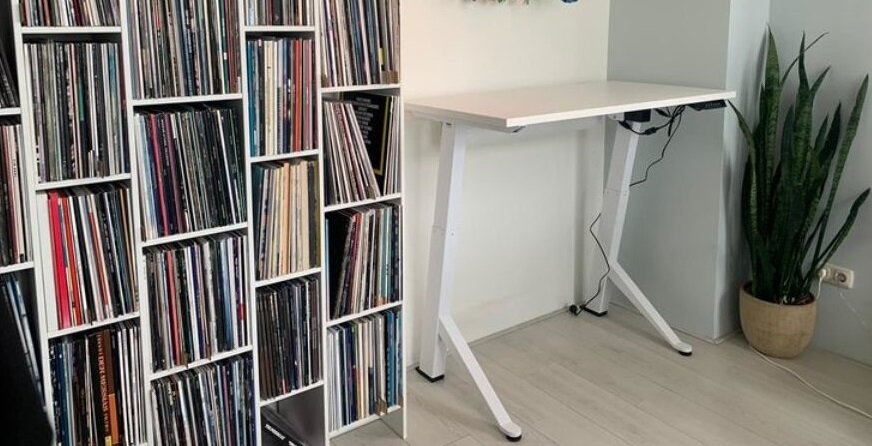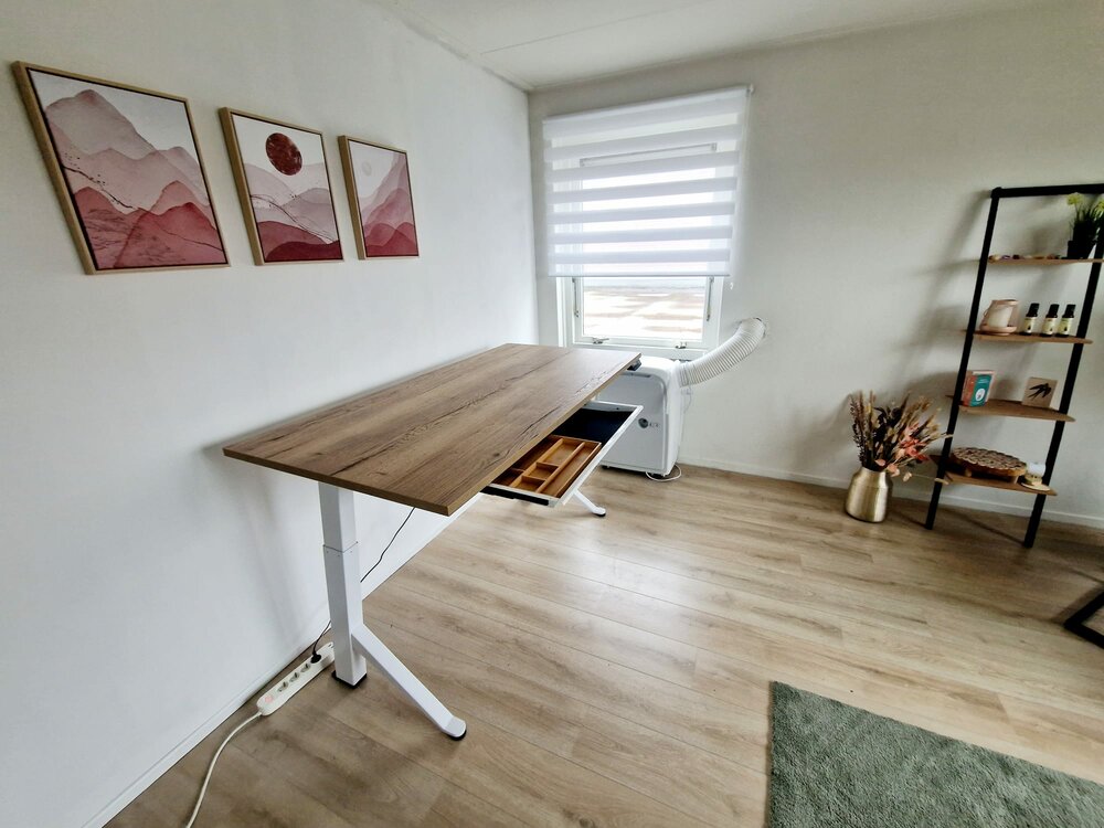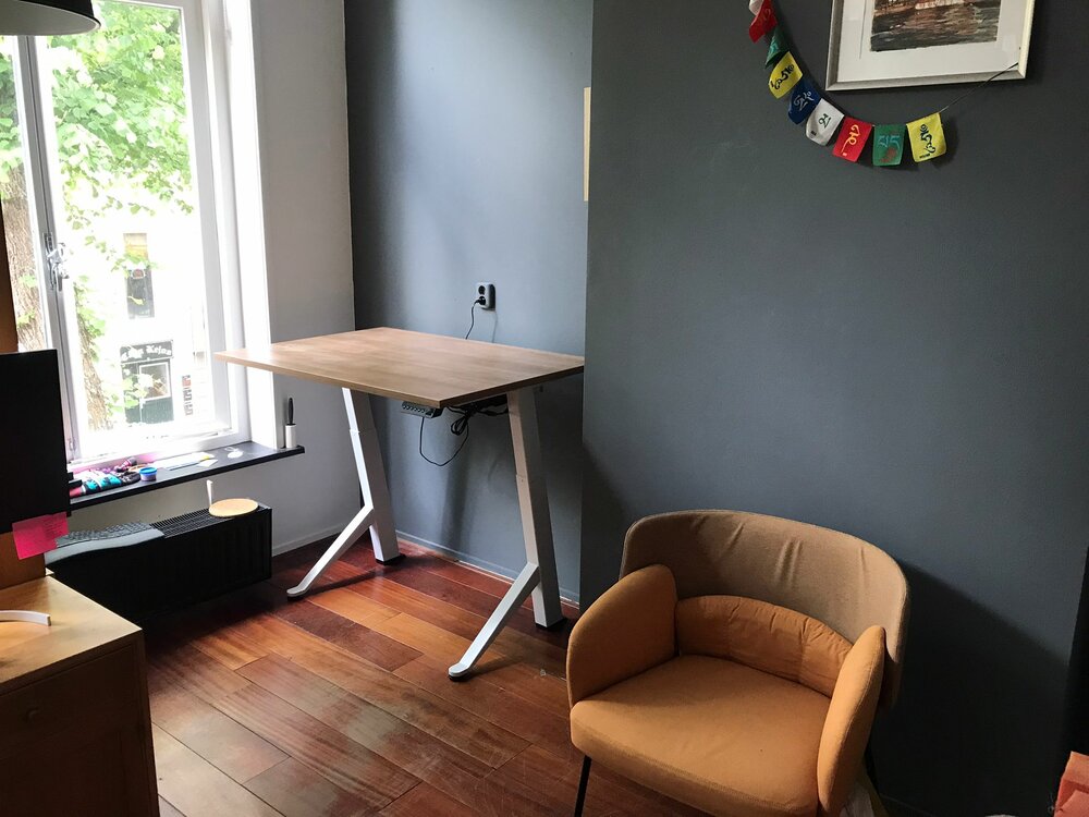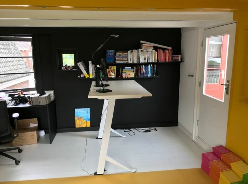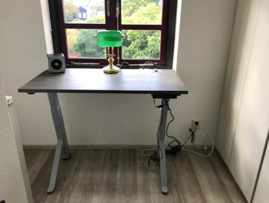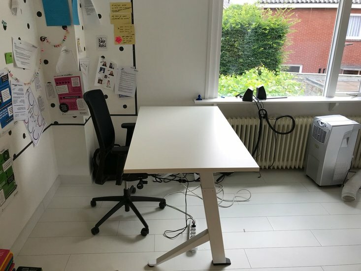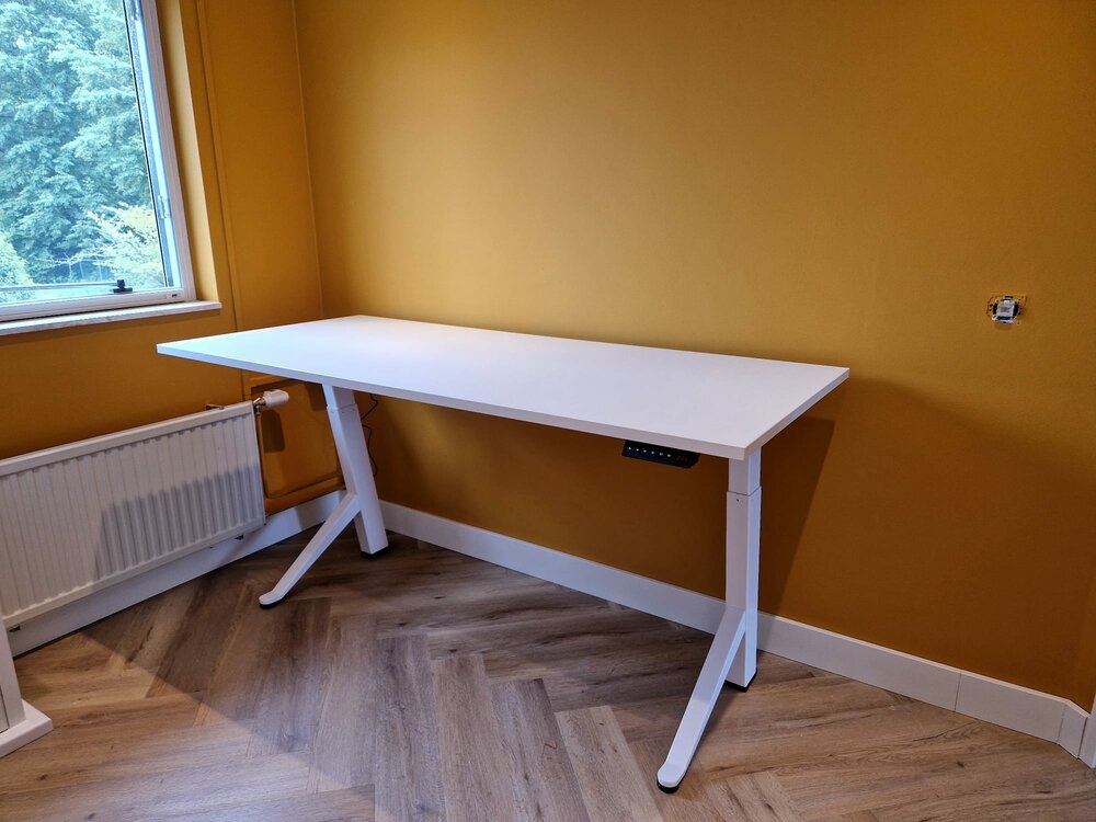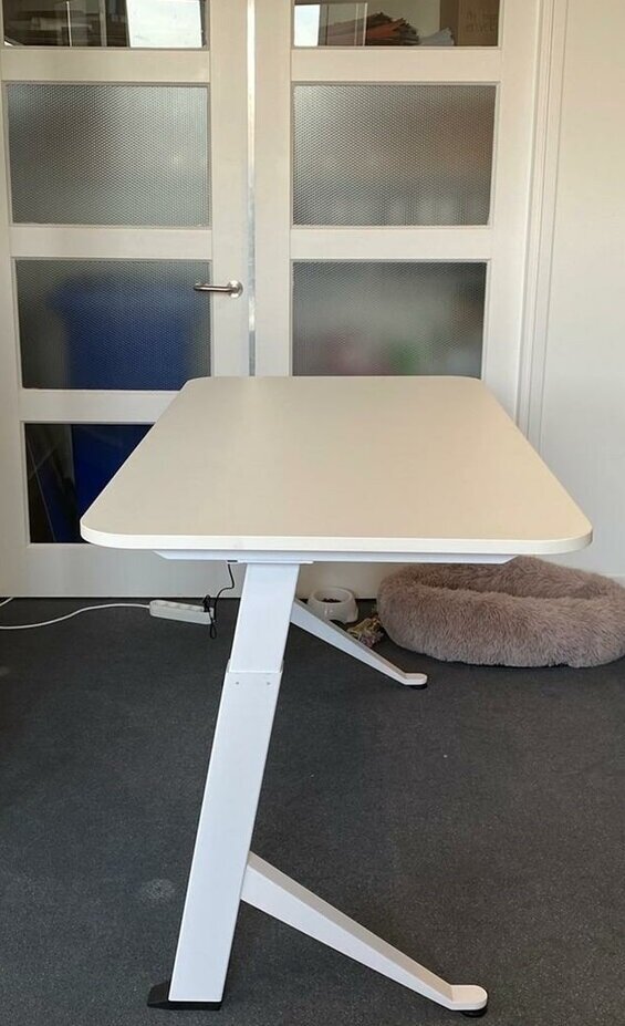 Stevig bureau. Handige kabelgoot. Het zitten en staan bevalt me zeer goed. Ik begin de dag staand, je beweegt dan veel sneller. En in vergaderingen online zonder camera of lange telefoongesprekken loop ik wat door de kamer. Voor mij de remedie tegen een hangerig gevoel van hele dagen thuiswerken.