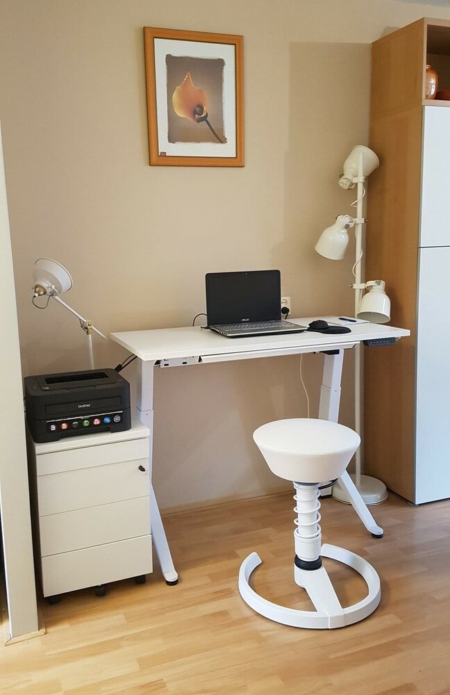 Na 8 maand aarzelen en twijfelen, toch maar de knoop doorgehakt om een tweede thuiswerkplek te creëren. We hadden nog een Stokke kruk, en aangezien ik op kantoor een sta-zit tafel heb was de keuze snel gemaakt. Uiteraard eerst bij de Zweedse gigant wezen kijken, maar al snel viel de keuze op de YDesk bij worktrainer.nl. En gelukkig maar.