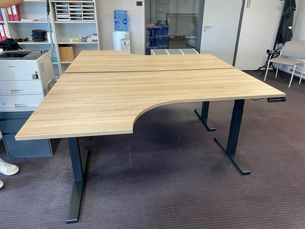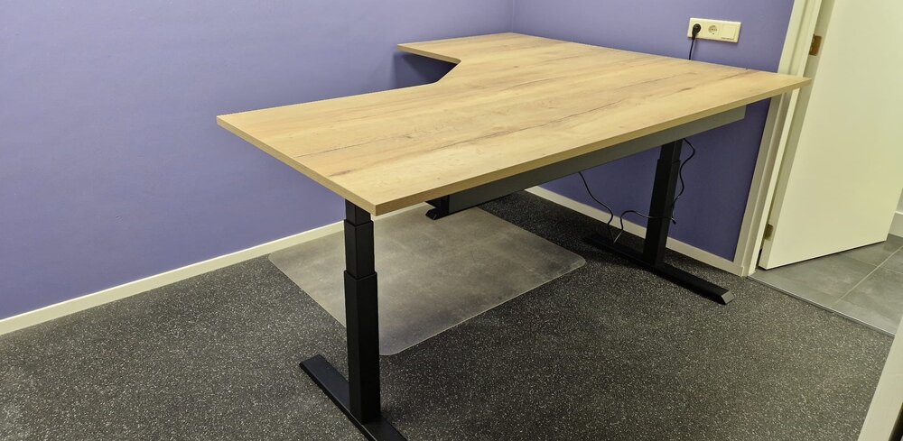 Een zeer goede kwaliteit bureau. Een stevig onderstel en solide systeem voor hoog-laag. Het blad is ook van stevige kwaliteit met een mooie print (eiken).