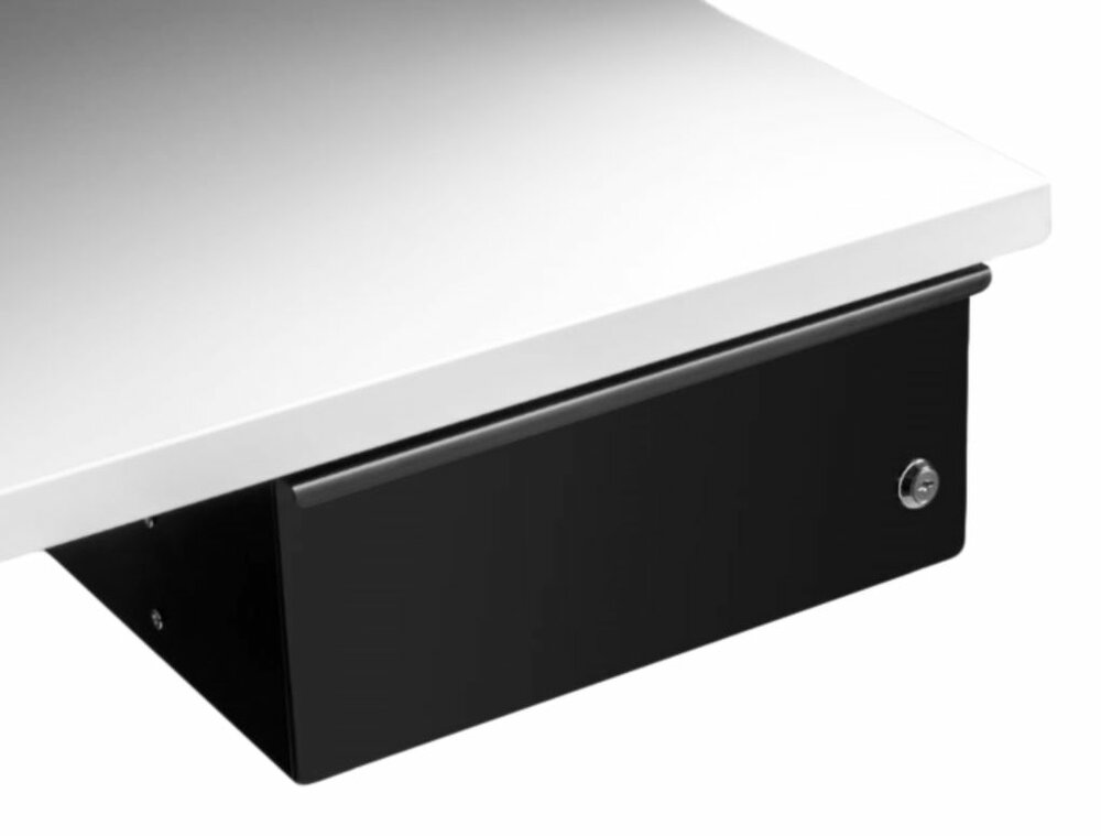 In de bovenste lade zit een lade-inleg met vakjes gemaakt van bamboe, waarmee kleine spullen als pennen en paperclips netjes opgebergd kunnen worden. Deze pennenlade is afsluitbaar, sterk en eenvoudig te monteren onder je werkblad. De Pennenlade Duo is verkrijgbaar in wit, zwart en zilver.