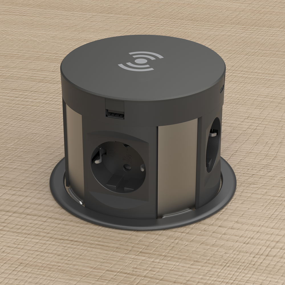 The Qi Power Pop-Up Meeting is the smart solution for modern meeting tables and workspaces. This compact built-in power unit combines design, convenience, and functionality in one sleek product. With 4x 230V sockets, 2x USB-A, and 2x USB-C ports, you always have enough connections for laptops, smartphones, and other devices. Even better: the top cover functions as a wireless Qi charger, allowing you to charge your phone easily without cables.