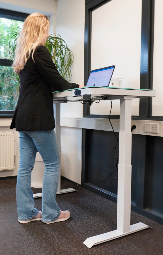 The LifeSpan Glass Sit-Stand Desk brings movement and joy to your workday. With an adjustable height from 62 to 127 cm, you can easily choose whether to sit or stand while working. This keeps your body active, helps prevent stiff muscles, and keeps you feeling energized and creative all day long.