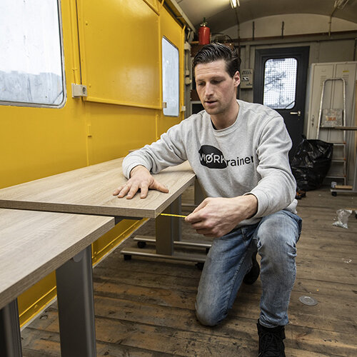 Worktrainer werkt voor de montage van zit-sta bureaus en het verzenden van pakketten samen met Ferm Werk, een sociale werkmaatschappij die mensen met een afstand tot de arbeidsmarkt ondersteunt.
