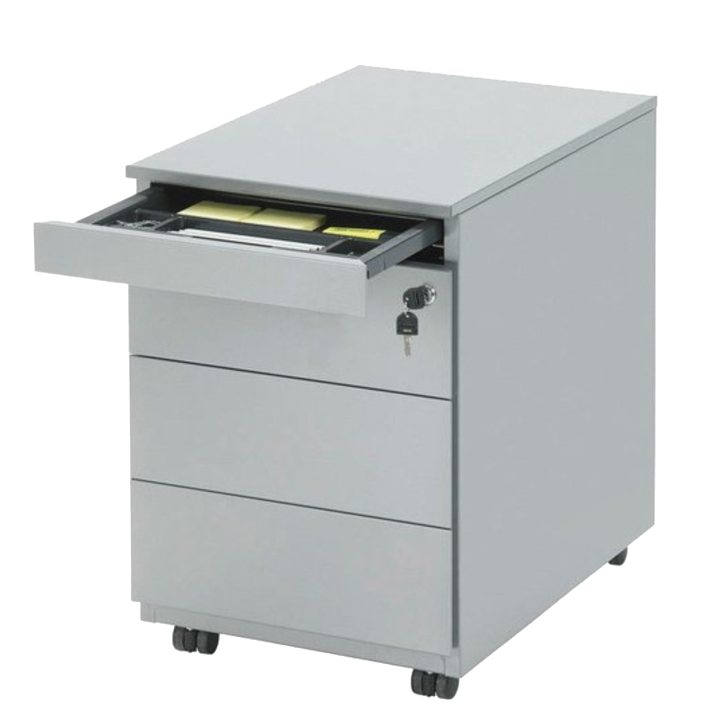 Stevig, metalen 3-ladenblok voor onder je bureau. Verkrijgbaar in zwart, aluminium of wit.