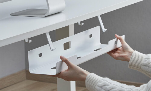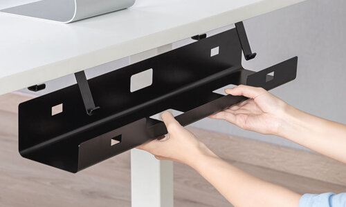 Kabelgoot van 60 cm of 145 cm breed. Handig uit de bijgeleverde beugels te tillen om bij de snoeren en stekkerdozen te kunnen komen. Verkrijgbaar in zwart, zilver en wit.
