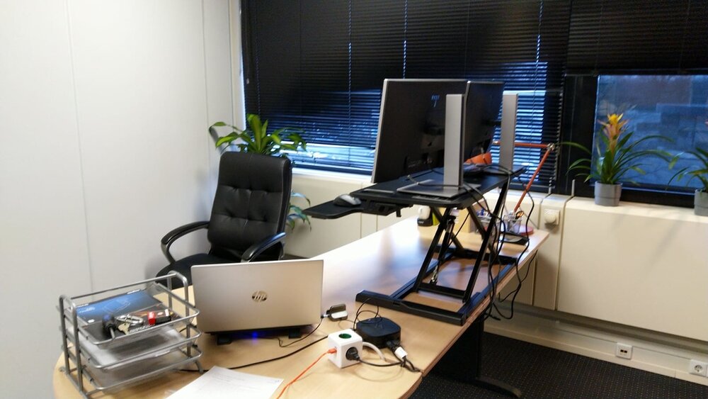 De electrische zit-sta verhoger is een hele goed oplossing als je je bureau meubel wilt behouden en toch zowel staand als zittend wilt kunnen werken. Het voelt aan als een stevig, degelijk apparaat en heeft voldoende ruimte voor zowel een laptop als een tweede scherm er boven. (Dat is wel effe wennen, maar werkt eigenlijk net zo goed als twee schermen naast elkaar)