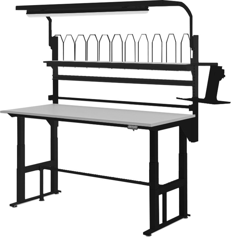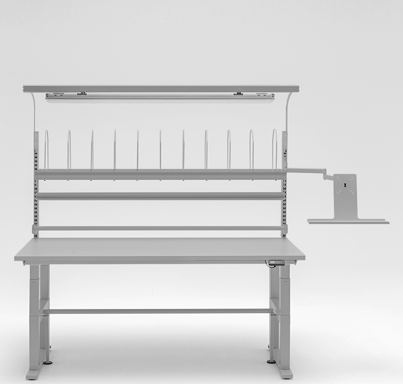 Wat deze tafel uniek maakt? Alle accessoires zijn standaard inbegrepen. Denk aan een papierrolhouder, bakkenrail, verlichting, monitorhouder, schappen én een verticaal profiel. Zo beschik je direct over een georganiseerde, efficiënte werkplek.