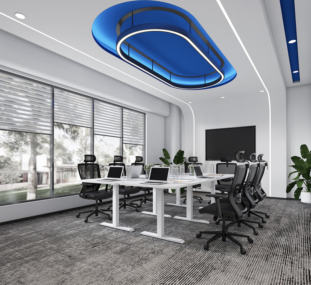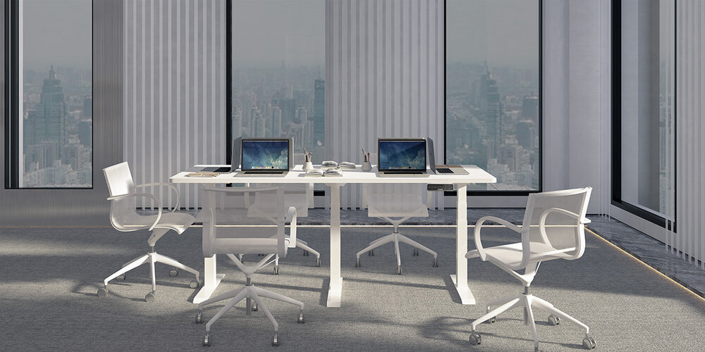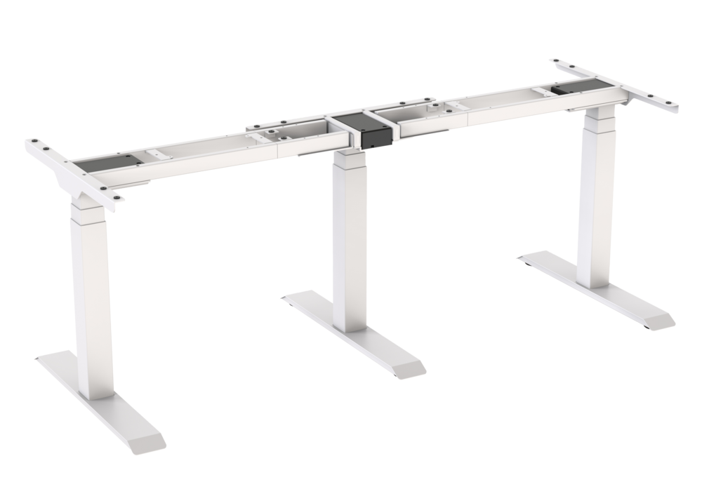 Elektrisch verstelbare vergadertafel met 3 motoren. De positie van het frame is verstelbaar in L-, V- en I-vorm en verkrijgbaar in zwart, zilver en wit.